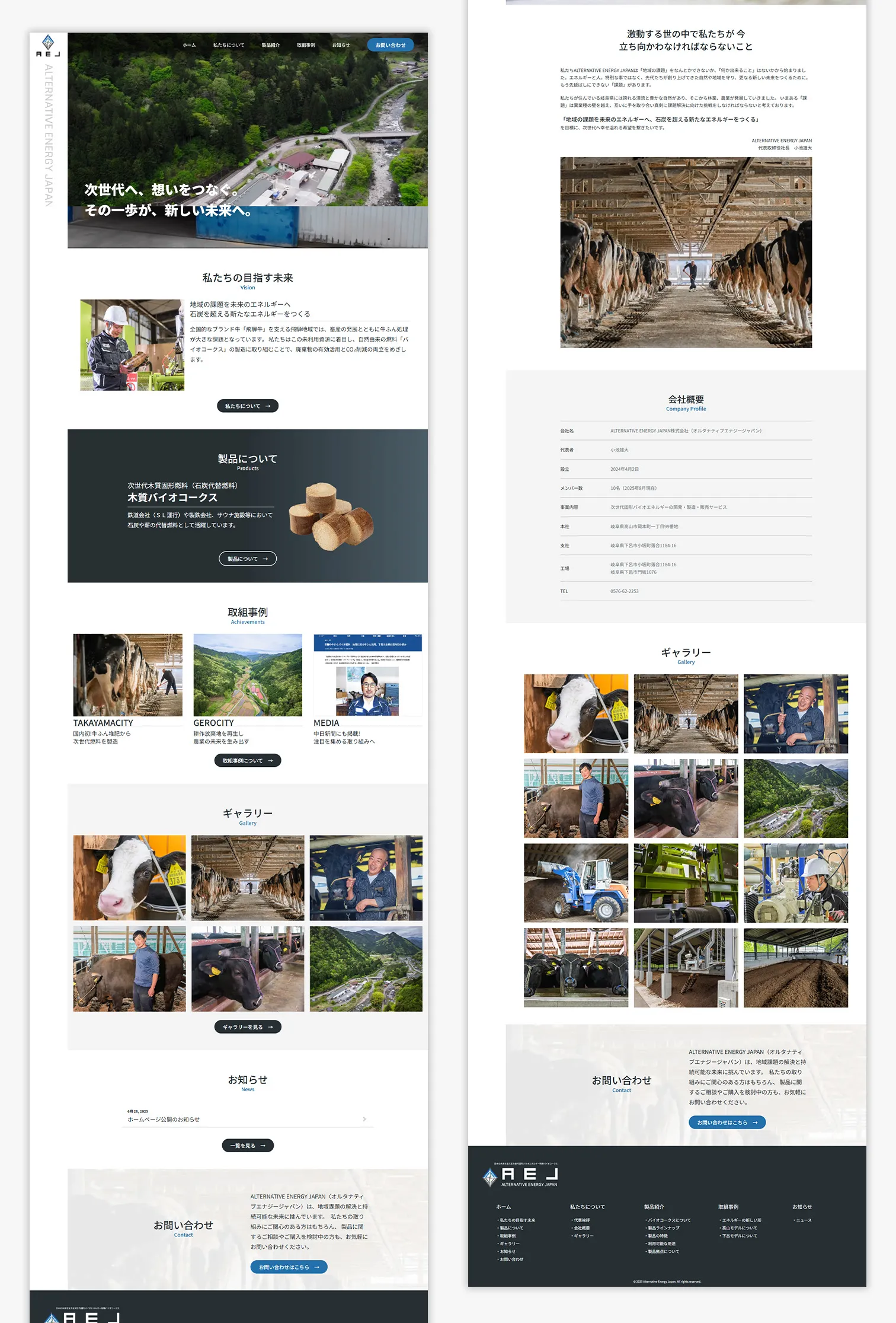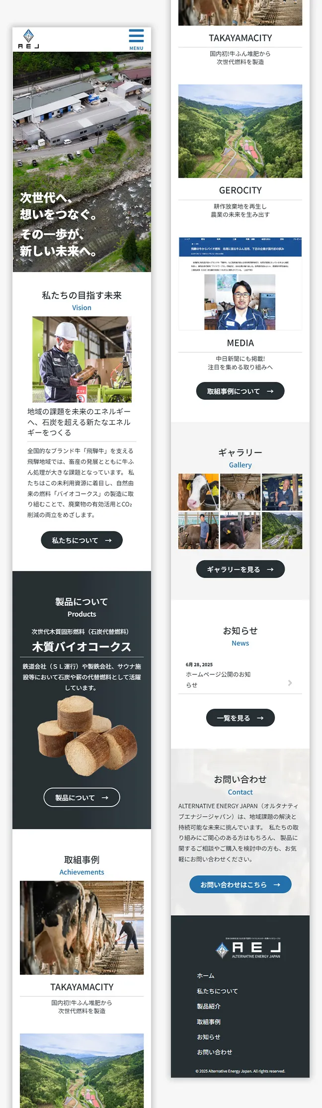 革新的なバイオエネルギーの開発を手掛けるAEJ様のコーポレートサイト制作を担当いたしました。 県や自治体、関連企業の皆さまに向けて、製品や取り組み事例をわかりやすくお伝えすることを目的に、信頼感のあるサイトづくりを心掛けました。